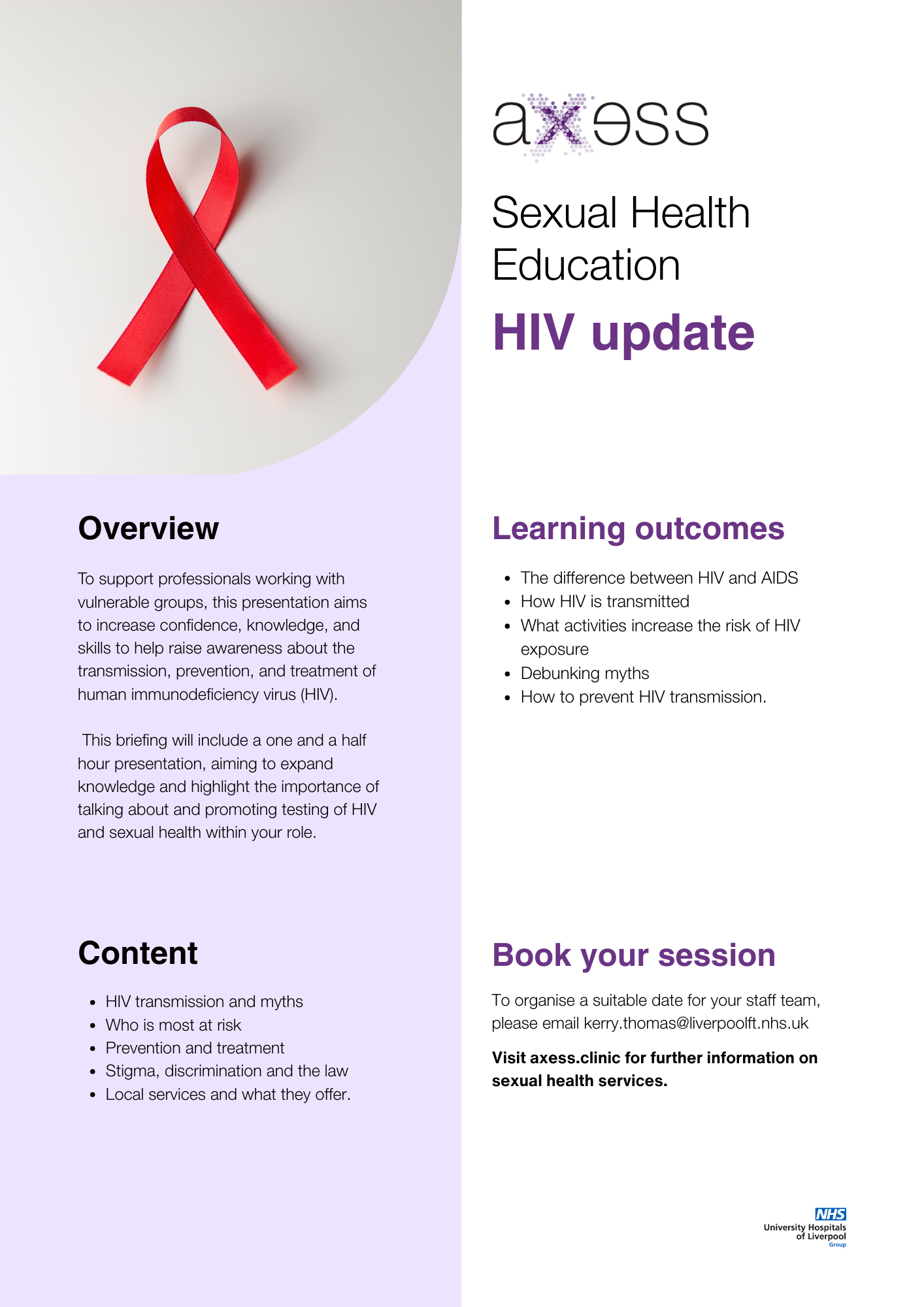 The axess sexual health Outreach Team are offering a HIV update session for professionals.